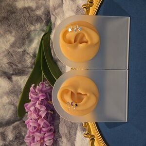 Chic sterling silver cuff earrings featuring star and moon designs. Perfect for adding a celestial touch to any outfit. No piercing just a cuff that hugs the ear.