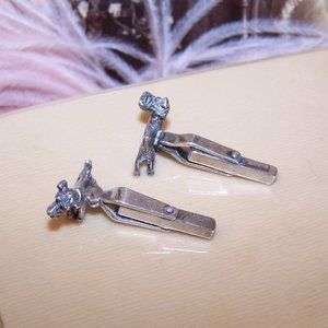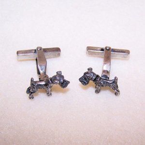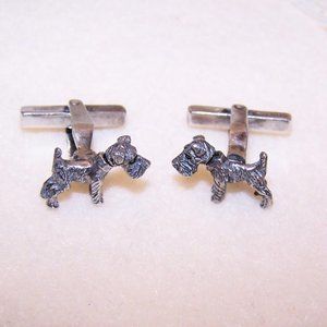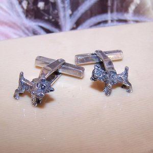 Dating to the 1950s/1960s or so, may I offer this pair of Sterling Silver (hallmarked as pictured) cufflinks featuring a pair of terriers to the front. The pieces are mechanical in that the heads of both dogs move back and forth. Fronts measure 5/8" wide x 1/2" high. Combined weight of the pair is 9.3 grams. Condition is very fine with no problems I can spot - just a lovely vintage patina to the silver.