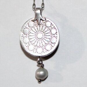 Sterling silver necklace with a picture of a stand of pine trees under resin with a cultured pearl dangle accent. The backside of the pendant is also decorative and could probably be turned around for a second look.