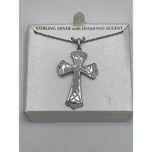 Beautiful sterling silver cross pendant that is etched and has two diamond accents. On Sterling silver very dainty chain. Brand new on original card but I do not have the original box. Comes from a smoke-free home.