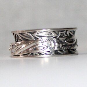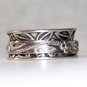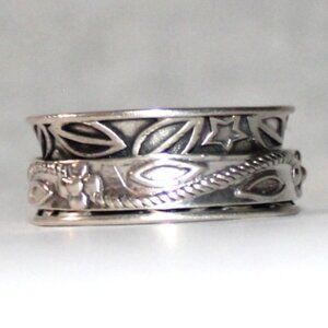 Sterling silver Djoy fidget ring. Ring has a narrow fidget band decorated with leaf like shapes and little flowers. The larger main band continues with leaf designs and little stars here and there.