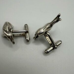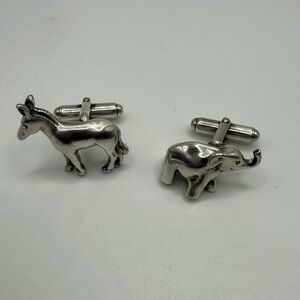 Unique mismatched cufflink set featuring a donkey and an elephant, finely crafted in sterling silver and both marked .925. These represent the Democratic and Republican parties — perfect for collectors of political memorabilia, vintage jewelry enthusiasts, or anyone who loves conversation-starting accessories.