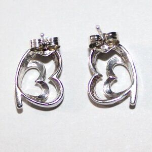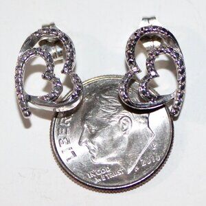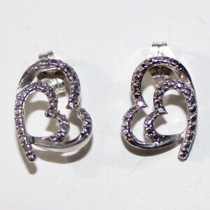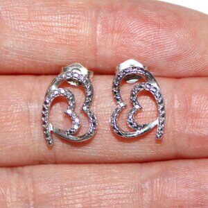Sterling silver stud earrings in the shape of double hearts. Earrings are made to look like they are set with stones but there are no stones.