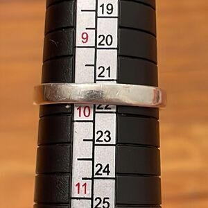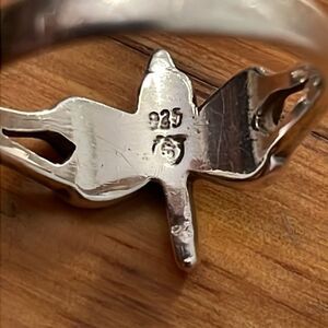 Sterling silver dragonfly ring with inlaid, blue opal in a womens size 9.75. Depending how the light hits the stones you see iridescent blues and greens. The band is open on each side. The ring has a low profile so it is ideal for everyday wear. The ring is stamped 925 and another mark I haven't been able to decipher. An In great pre-owned condition with little to no signs of wear.