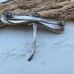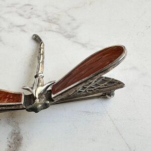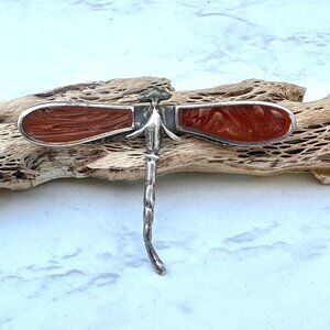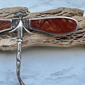 Sterling Silver Dragonfly Brooch With Carnelian Wing Inlay & Etched Detail