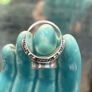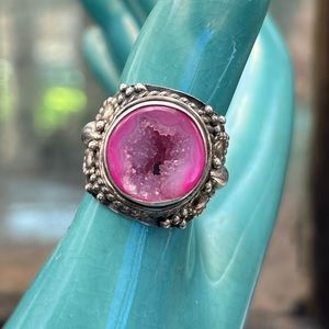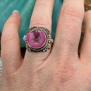 Really sweet rug, not too big, not too small. The stone is just a druzy quartz dyed bright pink. I used to fit this on my middle finger, believe it is around a size 5.5-6, but I have to find my mandrel to make sure. Has a 90s Bali design to it.