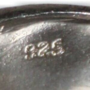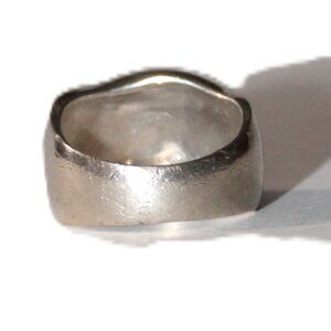 Sterling silver band ring set with multiple colored dyed mother of pearl shell. This was a well loved ring and have many tiny dings and wear marks on the back side of the ring.