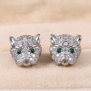 Sterling Silver Emerald Diamond Zircon Panther Cat Stud Earrings Women's Gift