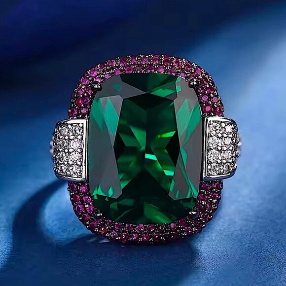 Sterling silver plated emerald and purple adjustable in size statement ring.