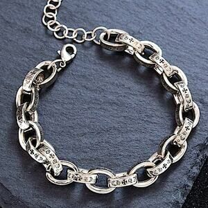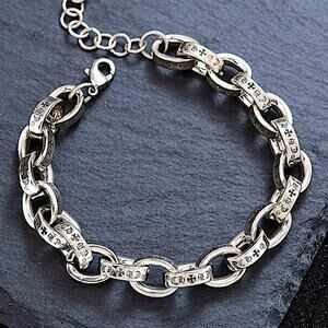 Sterling silver plated stainless steel unisex engraved cross heart chain link bracelet. Sizes vary from 8”- 10”.