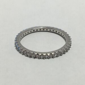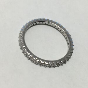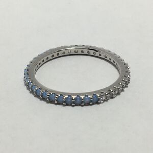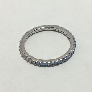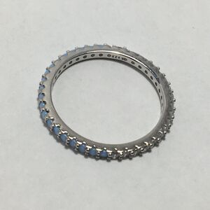An eternity ring with clear, sparkly Cubic Zirconia stones and milky blue simulated opals, also CZ. Stamped 925, platinum over sterling silver. Measures just under a US ring size 7. Thin 2mm wide band. Weighs about 1.4 grams. Its in good condition with some light scuff marks and scratches on the band.