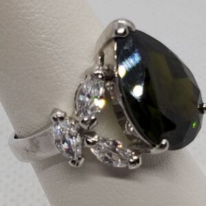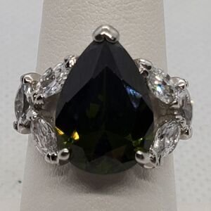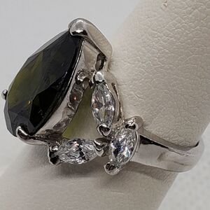 Sterling Silver FAS ring with a large green teardrop shaped stone with three clear stones on each side.