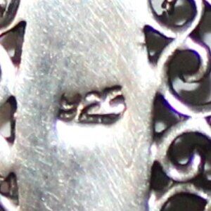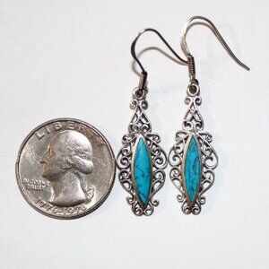 Sterling silver scroll work earrings set with faux turquoise all on hooks.