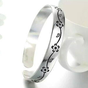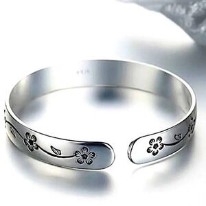 Sterling silver flower engraved cuff bangle bracelet