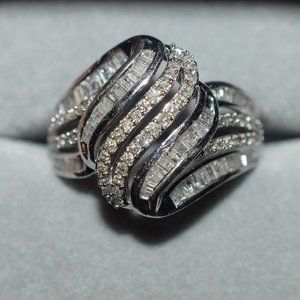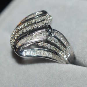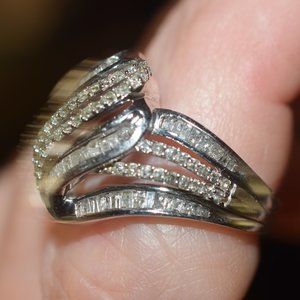 Hello, welcome to my listing. Up for sale are these very nice Sterling Silver & Genuine Diamond ring and 925 genuine diamond crossover earrings. The ring is in a size 7 and marked 925 and TU in heart. Not sure what it stands for. The earrings are 1-inch marked 925 SK9. Is for Allure Gems LLE. Both of these pieces are in very good condition. The ring comes in a grey velvet gift box. The earrings in a separate box. The ring has a lot of round diamonds and Baggette diamonds. I thought the earrings go very well with the ring. This would make a great gift. If you have any questions, please ask. Thank you and Happy Holidays