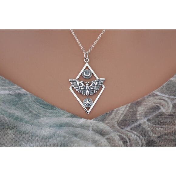 Sterling Silver Geometric Moth Charm with Sun and Moon Necklace