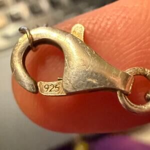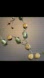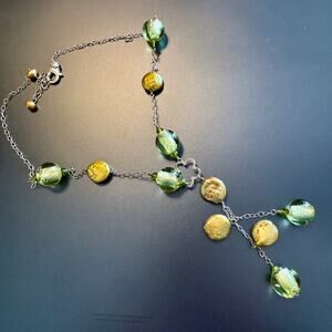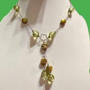 This is an absolutely lovely sterling silver lariat chain necklace featuring light green glass beads and golden mother of pearl beads. The lariat necklace also features a floral-shaped link. The chain measures 18" but can be worn shorter. The clasp bears the 925 marking to indicate sterling.