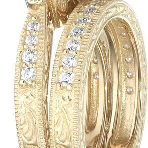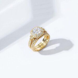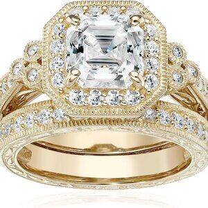 Features: This beautiful antique-style set includes a halo engagement ring with a dazzling 7mm asscher-cut cubic zirconia as the centerpiece, paired with a delicate half-eternity band adorned with pave-set Zirconia. Crafted from genuine 925 sterling silver and finished with a shiny yellow 23K gold plating. Total weight of the set is 2.4 carats — perfect for adding a touch of glamour.
