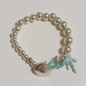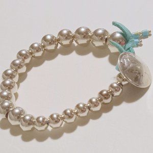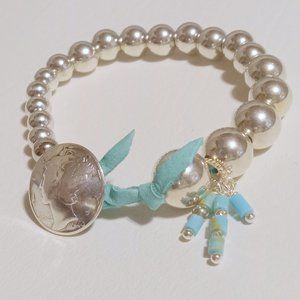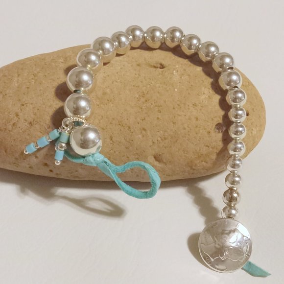 A flow of Graduated Sterling Silver beads abound on Tiffany Blue Buttery Soft Leather with Vintage Mercury Dime "button" to fasten this fluid wrist display ~ with Sterling Silver Turquoise bead dangles this piece can "stand alone" or if your like me will stack wonderfully amid your favorites