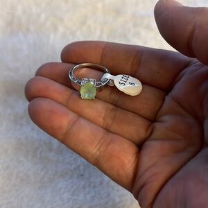 Elegant and minimalist, this sterling silver ring features an oval-cut green chalcedony stone in a secure four-prong setting. The sleek band and soft green hue make it a versatile accessory for both everyday wear and special occasions. Size 6 and marked 925 for sterling silver authenticity. A lovely piece for gemstone lovers or gift giving.