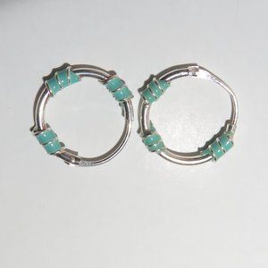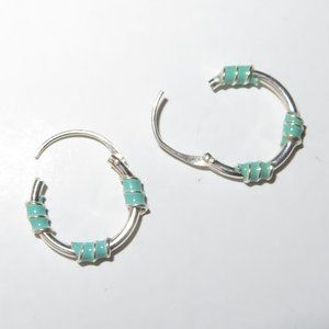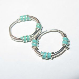 Small and cute Sterling Silver Green Enamel Accents Hoops Huggies Earrings.