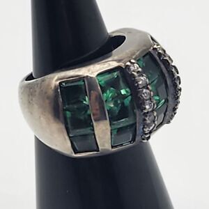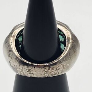 Sterling Silver ring from China with five channels of square shaped green crystals and two rows of small clear cubic zirconia.
