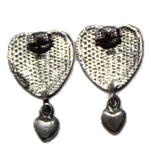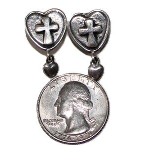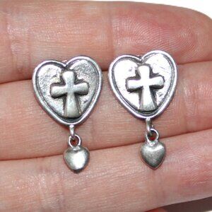 Sterling silver heart shaped earrings with a cross at the center and tiny heart dangle accent.