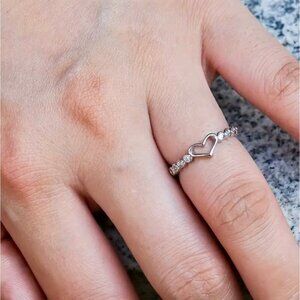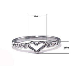 This ring is a simple little piece with a cute heart design. It's made of that shiny silver metal, and there are these tiny sparkly stones set around the band. It's a size 7, so it's a good fit for a lot of people. It's just a nice, everyday ring that adds a little something to your look without being too much.