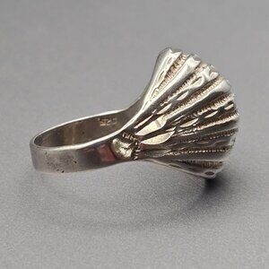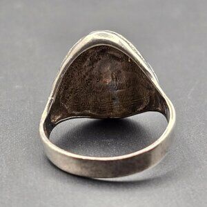 Marked 925 for sterling silver and signed by the maker (hallmark partially worn), the ring is sized at 7 with a band width of 3.4mm and a total weight of 5.69 grams. The craftsmanship suggests mid-to-late 20th century design, possibly artisan or boutique studio work, with a focus on texture and light play.