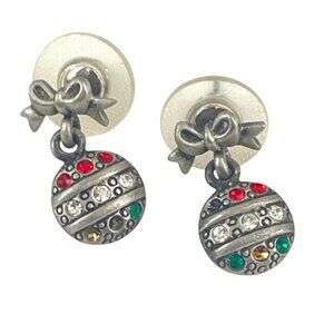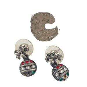Sterling Silver Holiday Ornament Earrings Red Green & Clear Crystals Rhinestones