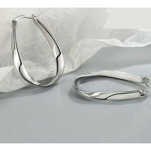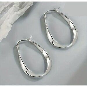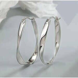These earrings are a bit different, which is kind of cool. They're hoop-shaped, but they have this twist to them, like a loop that goes on forever. They've got a kind of vintage feel, but they're still simple enough to wear with anything. They're light and comfortable, so they're easy to wear all day. It's just a nice pair of earrings that adds a little something extra to your look without being too much.