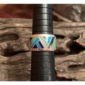 Gorgeous sterling silver inlayed ring made in Thailand. Combination of green, turquoise and lapis inlayed in geometric shapes with sterling silver trim on top and bottom. Ring measures .50 inches wide and is a size 8.75. Marked NF, 925 and Thailand.