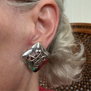 Sterling silver clip-on earrings marked 925 and tested sterling. Square and oriented on the diagonal, earrings are pillowed with intertwining hearts. Measurements in photos, weight is 12 grams.