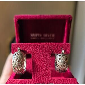 These intricately designed sterling silver hoop earrings feature a floral engraving, adding a touch of elegance and sophistication to any attire. Their lightweight and secure clasp make them a comfortable choice for extended wear, while the durable material ensures longevity. Ideal for accessorizing formal and casual outfits alike.