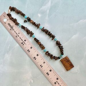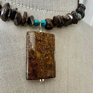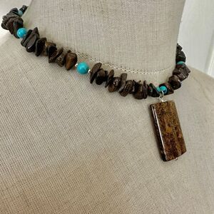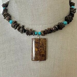 Bold and earthy, this artisan necklace features polished brown jasper chip beads accented with vibrant turquoise rounds and finished with a striking rectangular jasper pendant. The clasp is sterling silver, stamped 925 FAS THAI. A unique piece with a boho-Southwestern vibe that makes a statement whether worn with denim, linen, or layered with other favorites.