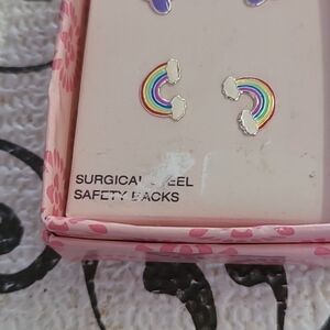 Adorable sterling silver, nickle free earrings for kids featuring a charming purple design and a colorful rainbow. Perfect for adding a touch of fun to any outfit.