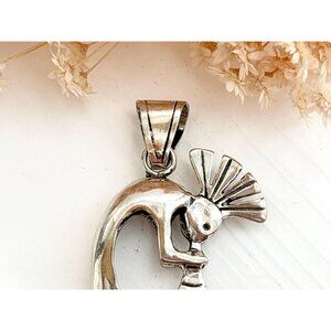 Gorgeous sterling silver kokopelli vintage pendant. The pendant has lovely hand carvings along the anterior of the pendant. Tapered bail. Native american inspired. Polished and gorgeous. Kokopelli is a prehistoric Native American symbol originating from the Southwest, most often depicted as a humpbacked, flute-playing figure. He is revered as a fertility deity associated with abundance, including the fertility of crops, animals, and humans, and is also known as a minstrel, trickster, healer, and rainmaker. His hump is believed to carry gifts, such as seeds, plants, flowers, or even babies, depending on the tribe.