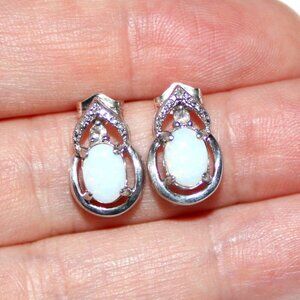 Sterling silver stud earrings set with lab created opal and accented with a tiny cubic zirconia stone.