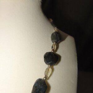 This beautiful 17-inch artisan-made necklace features striking labradorite stones and sterling silver accents. The iridescent labradorite, with its mesmerizing flashes of blue and green, creates a captivating look. The necklace is a unique handmade piece, blending natural elegance with artisanal craftsmanship.