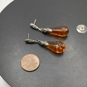 Sterling Silver Large Cognac Teardrop Baltic Amber Pierced Detailed Top Earrings