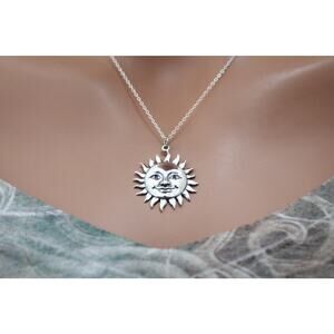 This is Sterling Silver Smiling Sun Pendant Necklace. The charm is on an 18 inch chain,