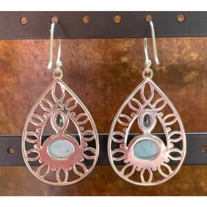 Sterling silver, larimar and blue topaz earrings. Teardrop shaped sterling silver dangle earrings. with loops, dots and stones in center. Oval shaped blue topaz is set on top of horizontal oval larimar. Both are bezel set. Earrings measure 2 inches long from top of fishhook and 1 inch wide. Marked PTI, 925 and India.