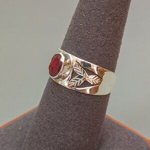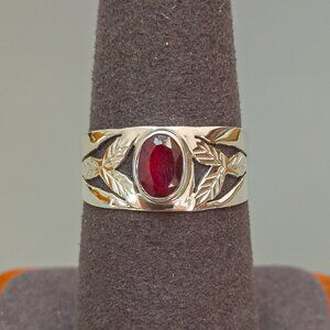 Sterling Silver Leaf Band Ring with Ruby – Bezel Set Oval Stone, Size 8.25