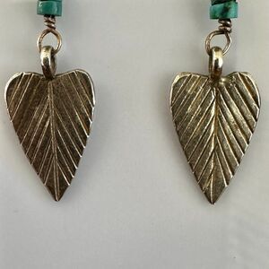 Artisan sterling silver earrings featuring etched leaf-shaped drops accented with genuine turquoise heishi beads. Lightweight and easy to wear, these have a natural Southwest-inspired charm. Perfect for adding a touch of boho style to everyday outfits or pairing with flowy tops and denim.