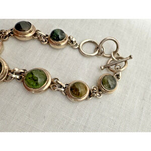 Gorgeous sterling silver link bracelet with graduated stones in greens, blues and purple browns.