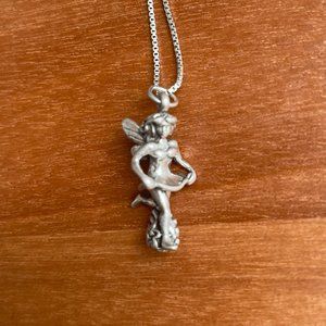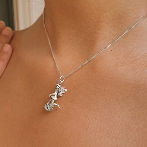 Embark on a whimsical journey with this sterling silver necklace, featuring a magical fairy gracefully dangling from its chain. This enchanting piece is sure to captivate your imagination and ignite a sense of wonder. The fairy pendant exudes an air of grace and charm, adding a touch of fantasy to your style. The sterling silver chain enhances the allure, creating a harmonious and captivating design. Whether worn as a symbol of your love for all things magical or as a unique fashion statement, this necklace will leave you feeling inspired and embraced by its warm, friendly, and calming presence.