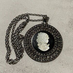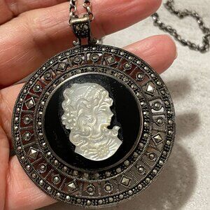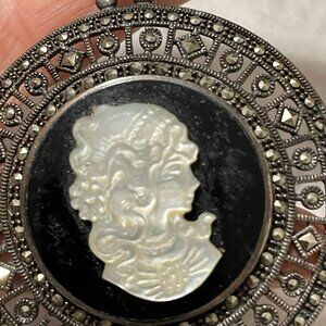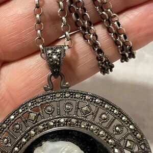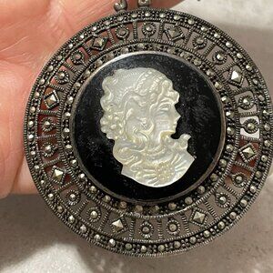 Sterling Silver Marcasite Mother of Pearl Cameo Round Medallion Necklace 14.5"