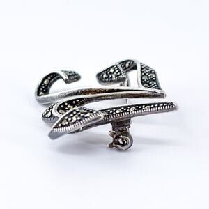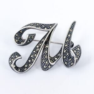 This vintage sterling silver script “M” brooch sparkles with marcasite accents, offering timeless elegance for any jewelry collection.