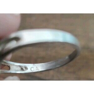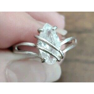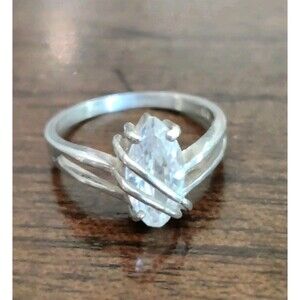 This Sterling Silver Marquise CZ Ring features a crossover design, making it a unique and stylish piece of vintage jewelry. The ring is signed by the brand CA and is made of 925 sterling silver, with a main stone shape of marquise. The main stone is a cubic zirconia, and it is a size 8 ring designed for women. The silver color and vintage nature of the ring add to its charm and elegance, making it a beautiful addition to any jewelry collection.