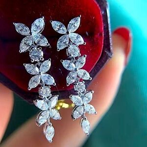 Sterling Silver Marquise Cut Crystal Flower Dangle Earrings Wedding Bridal